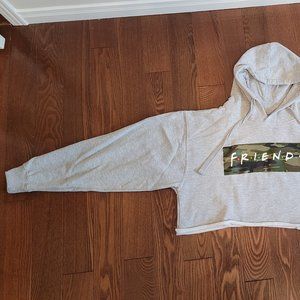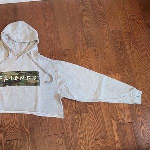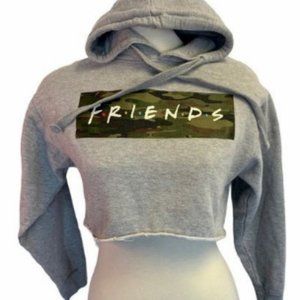 Super cute FRIENDS camo design on grey cropped hoodie sweatshirt, with raw cut hem at the bottom and drawstrings on hood. No rips or stains.