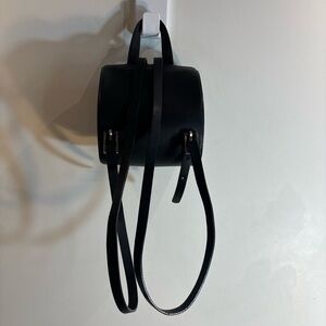 FRYE MINI Backpack Snap Closure Smooth Leather Adjustable Straps Si gle Compartment Top Handle Contrats Stitching. Elegant black leather bag perfect for any occasion. Features a sleek design with a versatile strap. Ideal for adding a touch of sophistication to your outfit. Inside small separation of lining. Not visible when closed or when wearing. Measurements in oictures. Strap: 37”