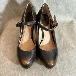FRYE Sz 6 Miranda Mary Jane Almond Toe Heeled Smooth Leather Distressed Shoes. Mary Jane pump silhouette. Brown leather upper. Adjustable ankle strap. Almond toe. Stacked heel Antiqued brass hardware. Heel height: approx 4" Shoes show normal signs of wear, including areas of scuffing on leather uppers and scuffing on outsoles. Bit of stretch on elastic ankle strap.