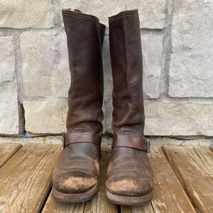 Classic and durable, these Frye brown leather engineer boots are the perfect blend of style and functionality. Featuring a timeless harness design with brass buckle accents and sturdy Goodyear-welted soles, these boots are built to last. The pull-on style and soft leather lining ensure a comfortable fit, making them ideal for everyday wear or rugged adventures.