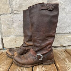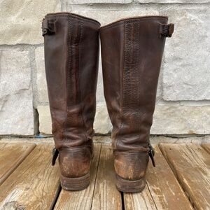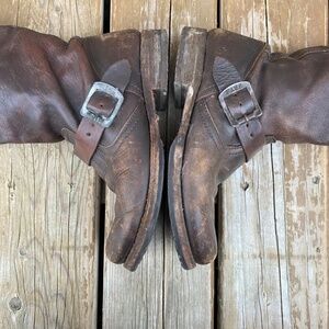 FRYE Woman’s Vintage Veronica Slouch Brown Leather Harness Engineer Boots Tall