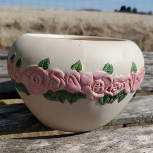 Incredible beautiful ceramic pottery FTD vase made in the Philippines. This 1990s flower pot is the perfect cottagecore piece with its delicate raised painted rose border vine. Add some soil, a few stones and a cute succulent to complete the look!