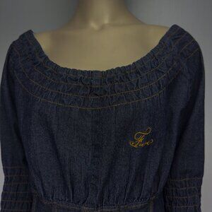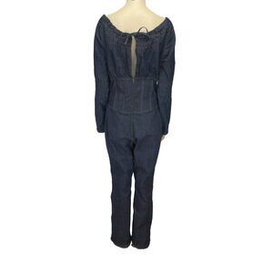 FUBU Denim Corset Waist Puff Off Shoulders Straight leg Stretch Jumpsuit sz XL L