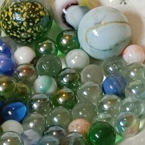 A great vintage lot with oil slick, tiger eye, marble, pear, opal look. Fun for every taste. Glass marbles.