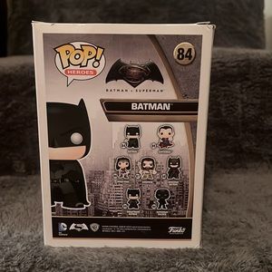 Wearing a grey suit, with his black mash, and black bat logo, with a gold belt.