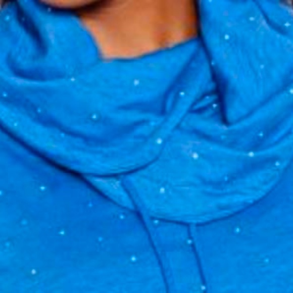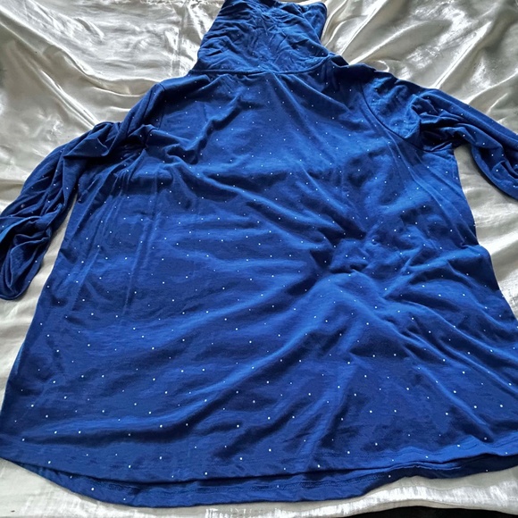 FUNNEL NECK TOP, BLUE WITH DOTS, SIZE 4X, DRAWSTRING NECK, SHIRT TAIL HEM, COTTON/POLYESTER, ¾ SLEEVES ROLL UP, PULL ON, ADDITION ELLE, IN ORIGINAL BAG, TAG ON, NEVER WORN