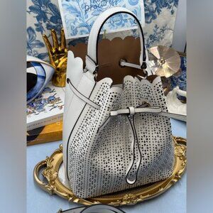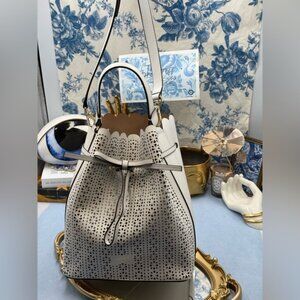 🆕 FURLA 🧿 NWOT Constanza Laser Cut Leather Drawstring Bucket Bag, Chalk