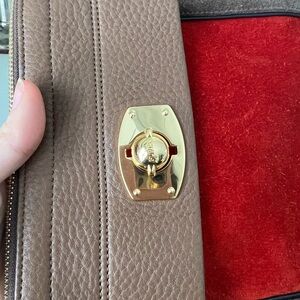 Features a gold turn lock that opens front pocket.