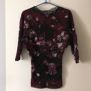 FUZZI by JEAN PAUL GAULTIER Mesh Burgundy + Black Floral Lace Trim Top S