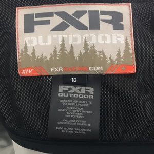 FXR soft shell jacket, real tree white camo with pink accents, unlined waterproof outdoor. Great condition,light wear. Size 10. Cuff sleeves with finger grip.