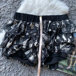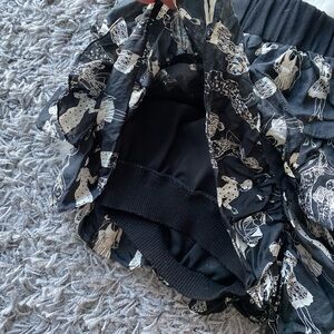 Add a touch of playful luxury to your summer wardrobe with these stunning silk shorts by Fa&Pa. Featuring a unique hand-drawn style print of fashionable figures, these shorts combine high-end fabric with an artistic, avant-garde design. The tiered ruffle layers create beautiful movement and a feminine silhouette, making them perfect for an elevated vacation look or a chic city outfit.
