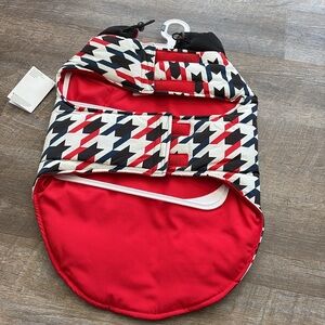 Keep your pup warm and runway-ready with this Fab Dog XL houndstooth puffer jacket, in new condition with tags. Designed for both comfort and style, this jacket features a bold red, black, and white houndstooth print, a ribbed black turtleneck collar, and a sleek quilted puffer design that’s perfect for chilly walks or photo-ready moments.