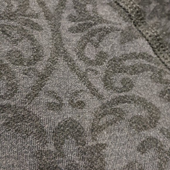 This is a fabulous piece. Fitted 1/4 zip long sleeved midi dress, high neck, solid black sleeves and side panels with a black on black jaquard pattern on center and back panel. Perfect condition, rip tag still attached, size L