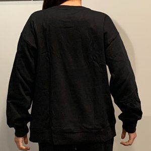 Black long sleeved crewneck sweater. Material is lightweight and thin. Perfect for walking or putting on if you have a chill.