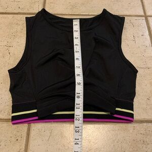 Elevate your activewear game with this stylish and functional Fabletics black cropped tank top! This versatile piece can be worn as a light-to-medium support sports bra or a trendy cropped workout top. It features a unique crisscross or wrapped front detail that adds a flattering touch, and a vibrant neon yellow and fuchsia pink banded hem for a pop of color.
