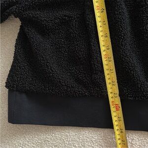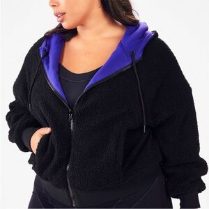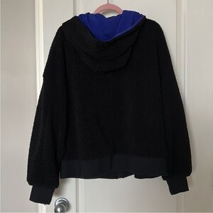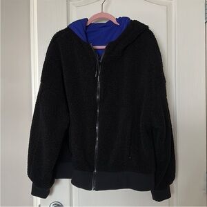 Luxe and heavyweight teddy with a super soft lining. Zippered front with drawstring hood. Front zip pockets for sherpa side and front slant pockets sweatshirt style on blue/purple side. Large batwing style sleeves.