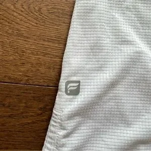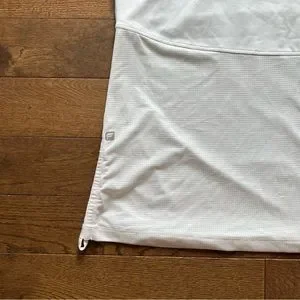 - White athletic tank top with some mesh detailing and a cinch detail at the side
