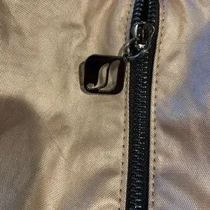 Two side zipper pockets, with black vegan leather straps and bottom. Netted pockets inside along with separate shoe bag (included!). Very well made bag with lots of unique potential!