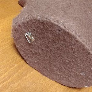 I think this is made of felt. There are no holes. The felt is a bit roughed up, as some of the photos show. There is a metal loop on the back so it is easy to hang, and it's lightweight too.