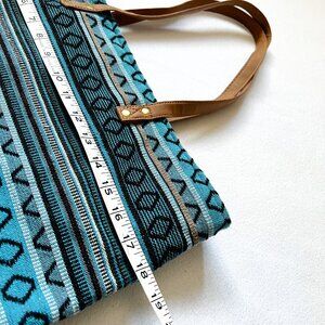 Turquoise and black handbag, with fuchsia lining. Inside pockets both open and zipper. Snaps closed. Faux leather strap.