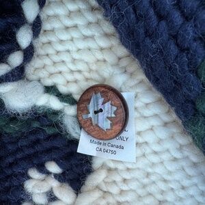 Comes with delightful wooden maple leaf decorated buttons (and an extra button inside whould you lose one.)