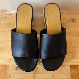 black platform, slip-on sandals, jute wedge, open toe, chunky heel, neutral tones, Y2K footwear, summer shoes, casual slip-ons, statement sandals