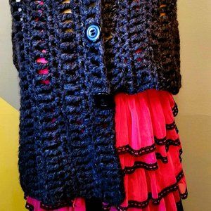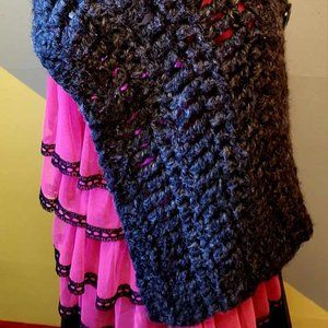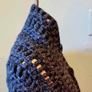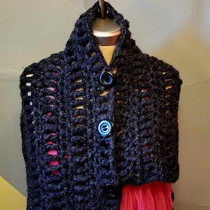 This gorgeous cozy capelet, hand-knitted crochet in an extra chunky and warm wool blend. The color is a dark charcoal grey. The feeling is soft and wonderfully warm to snuggle up with. The look is rustic boho chic. Wrap up in this bulky capelet and you'll not want to take it off!