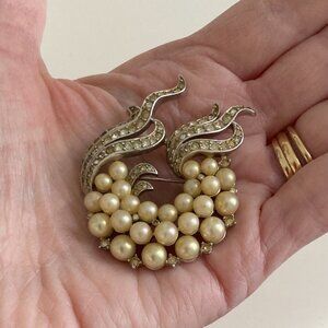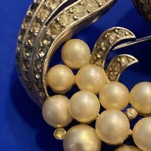 With its wreath of creamy faux pearls and ribbons of sparking rhinestones, this is a very elegant piece measuring about 1-1/2 inches in diameter. The Trifari mark (crown over the T and a copying symbol) dates it from 1955 to 1969. In very good condition, with nice nacre on the pearls and just one tiny rhinestone missing from what I can tell (see last picture).