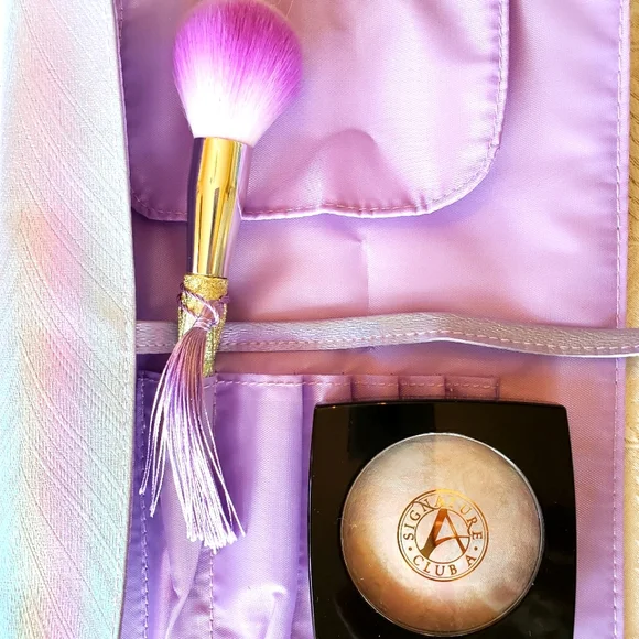 Face powder kit includes a powder brush, rainbow irredesent powder by Signature Club A and carrying case.