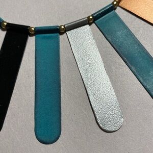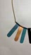 This striking statement necklace features a fan-like design with elongated pieces arranged in a semicircle. It is suspended on a delicate gold-toned chain, adding elegance to its vibrant gold and green color palette. Perfect for making a bold fashion statement.