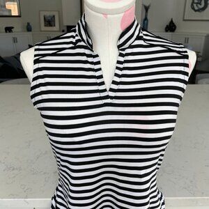 Fairways by Nancy Lopez Casual Sleeveless Mandarin Collar Open V Neck Striped DeLux Dri Golf Top in Black + White NWOT