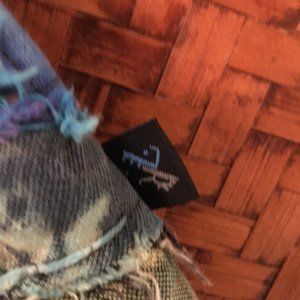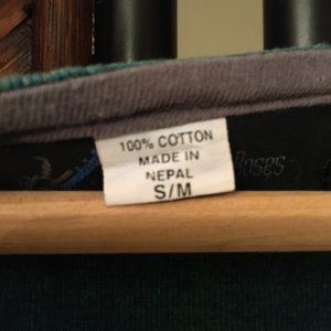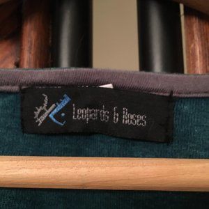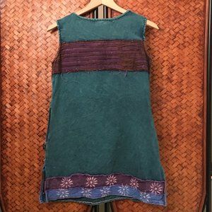 Very good preowned condition, forest green, distressed tank top with patchwork fabric in baby blue, denim blue, leaf green, purple, orange and red and white flower prints by Leopards and Roses. Made in Nepal. Playful, summery and cute. Can be worn with a thin t-shirt underneath as well. A unique one-of-a-kind piece. One look at it is enough to cheer you up.
