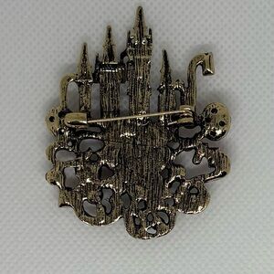 This large, ornate brooch features a beautiful European castle dripping with intricate embellishments. The metal has a beautiful antiqued gold-tone finish, giving it a luxurious, vintage feel. A great gift idea for anyone who loves castles or maximalism.