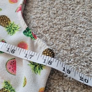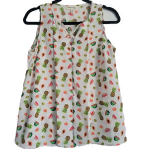 This top is just the cutest. If you are a sucker for anything with a unique, fun, print, then this top is for you! It's a lightweight, sleeveless v-veck with cross detail design, top with a print that has pineapples, mangoes, watermelon, kiwi, and grapefruit. This is such a cute top to pair under a blazer or wear tucked into a high-waisted pair of shorts. The size is XS, and it's in like new condition.
