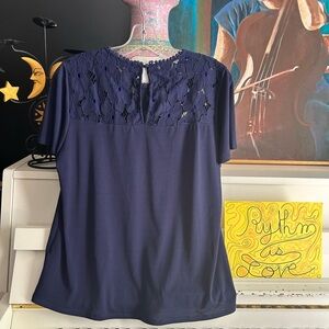 Chic navy blouse with delicate lace yoke. Short sleeves and relaxed fit. Ideal for versatile styling.