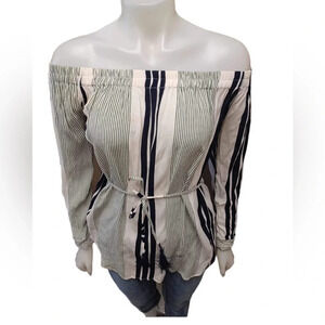 Simply gorgeous long sleeve garmet. A hi-lo hem with elasticized drop shoulders, this dress is off white with bold black and green stripes. It's got belt loops and the matching sash style belt is included. The cuffs can be rolled and buttoned up.