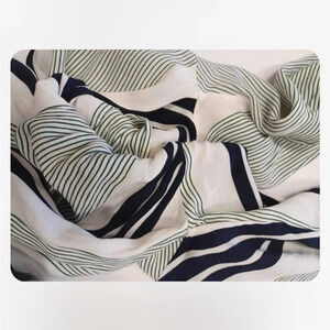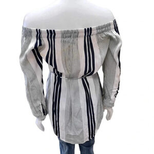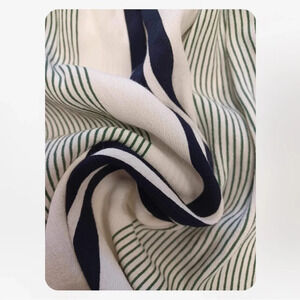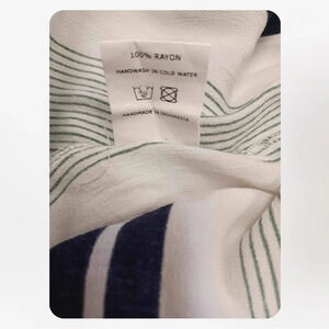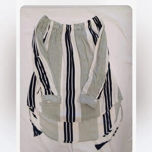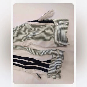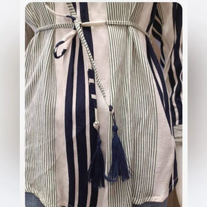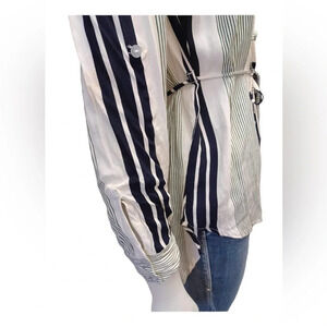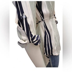 Simply gorgeous long sleeve garmet. A hi-lo hem with elasticized drop shoulders, this dress is off white with bold black and green stripes. It's got belt loops and the matching sash style belt is included. The cuffs can be rolled and buttoned up.