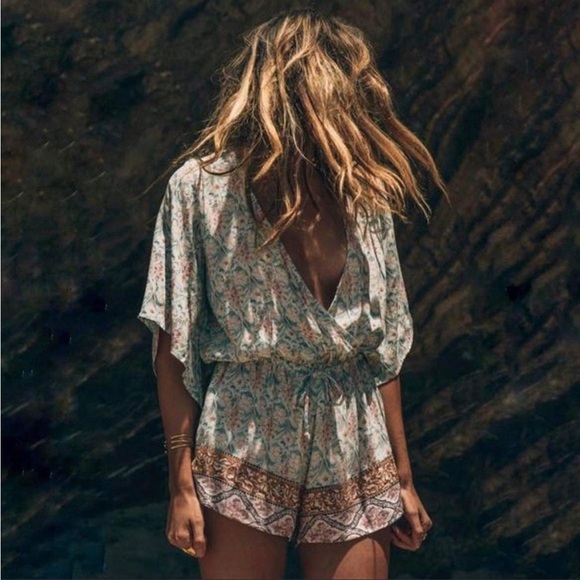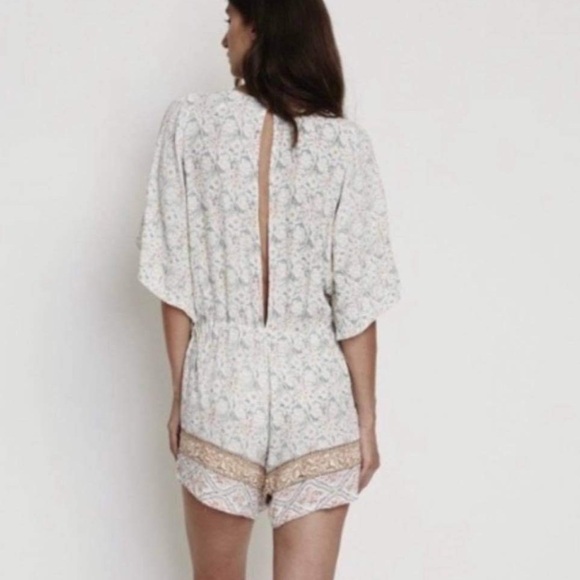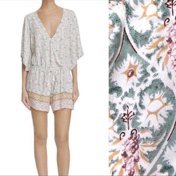 A muted floral motif and draped kimono sleeves lend a breezy, bohemian vibe to this effortless romper from Faithfull the Brand.