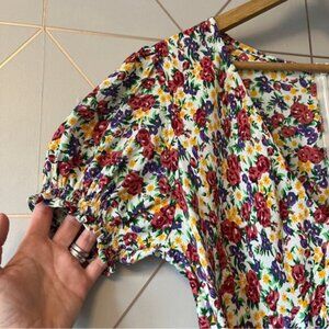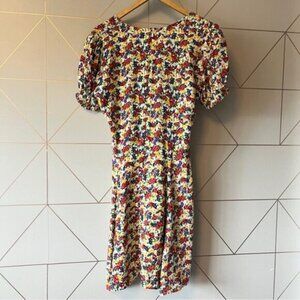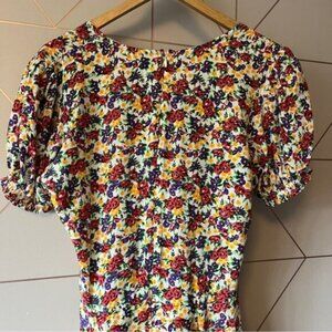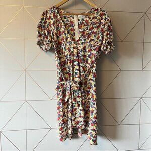 Faithfull the Brand Rafhaela Floral Dress in excellent pre worn condition. Short sleeves, stretch-smocked cuffs. Banded waist, attached self-tie waist sashes. Decorative buttons at skirt front. Allover 90’s inspired floral print. Concealed back zip with hook-and-eye closure. Please see all photos.