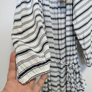 Off-shoulder striped maxi dress. Features a tie waist and side slit. Perfect for casual outings.