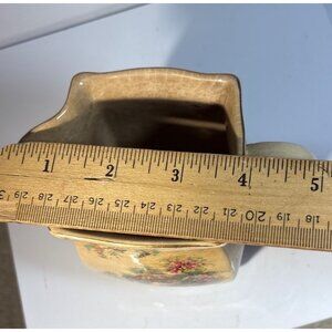 This vintage pitcher features an English cottage scene and vibrant floral accents. Its crackle glaze finish adds charm and authentic vintage appeal.