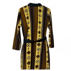 A fun indigenous fusion of Western meets Aztec meets Peruvian style in this Brown, Black, and Mustard cotton cardigan. There is no brand name inside and believe it is made by an artisan based on the inside details, there is room for someone to make it an inch bigger if you have a tailor. Bought online and only tried on, ready to be shipped.