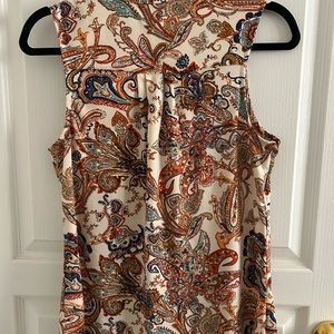 Cleo Petites sleeveless pullover v-neck top with cute v/silver snap front. 95% Polyester + 5% Spandex, slightly textured fabric hangs nicely. Paisley print works with everything, looks great with denim.