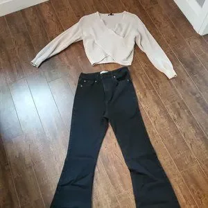 Wrap Crop Sweater and Black Bell Bottom Jeans
