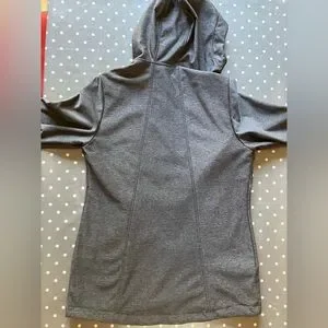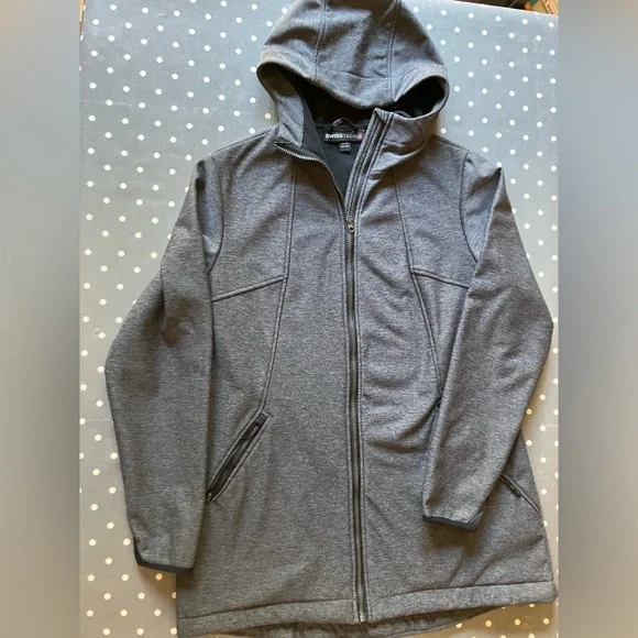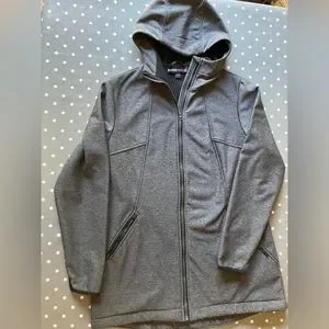 Weather resistant, fleece-lined hooded jacket. Zippered pockets and thumb holes on the sleeves. Good condition, comfortable.