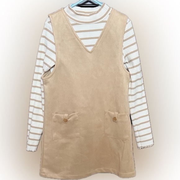 Tan dress with front pockets. Striped long sleeve top in cream and tan. Comfortable and stylish for kids.