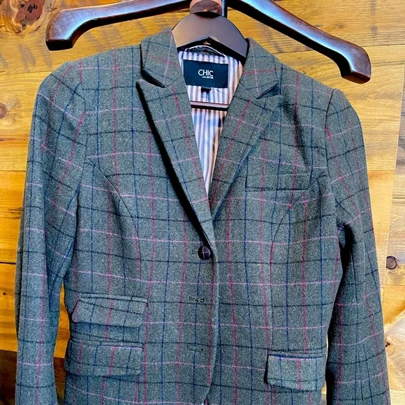 Hardly worn dark olive/military green blazer with fine plaid of navy, burgundy & soft pink. Pairs great with jeans or chinos/office pants. I just don’t wear it anymore as I’ve changed jobs.