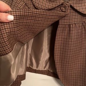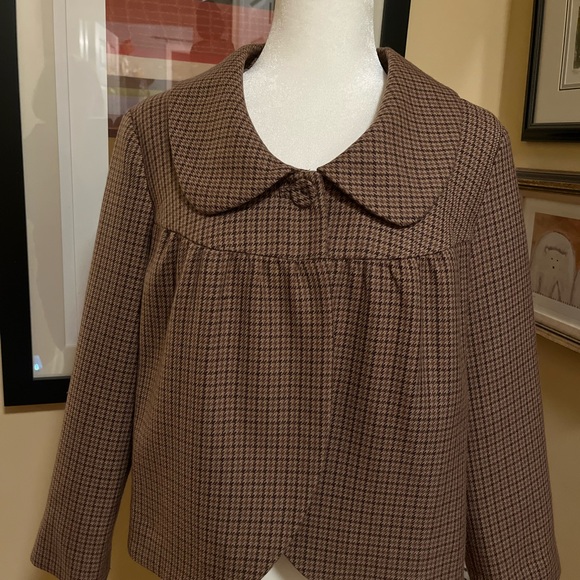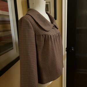 Unique retro-inspired fall jacket from Joe Fresh. Small herringbone check in beautiful brown tones. Swing style with back pleats and single button closure. Fully lined. Size 14. Wool/polyester blend with polyester lining.
