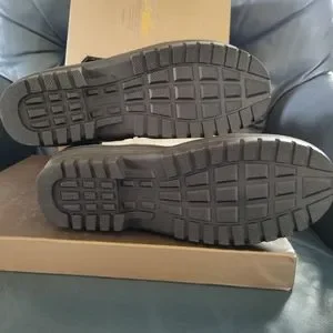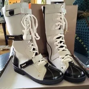 Brand New military style, lace up boots..... zipper closure on inside and three velcro adjustments along the outside. Silver colour PVC with black accents and fleece inside. Not water proof!!!