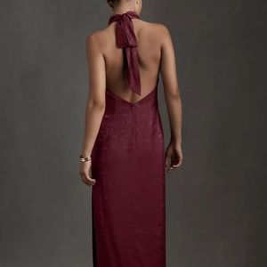 Featuring a high halter neckline with take-a-bow ties. Texture, dimension, and a sleek column skirt with a high leg slit.